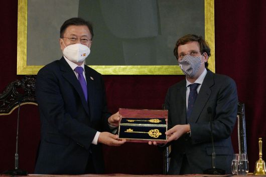 알메이다 마드리드 시장은 환영행사에서 문 대통령에게 ‘황금열쇠’를 선물했다. 그는 황금열쇠를 가리키며 “마드리드시의 문이 언제든 열려 있음을 뜻한다”고 말했다. 언제든 문을 열고 찾으라는 뜻으로 개방성과 교류의 중요성을 강조한 것이다.