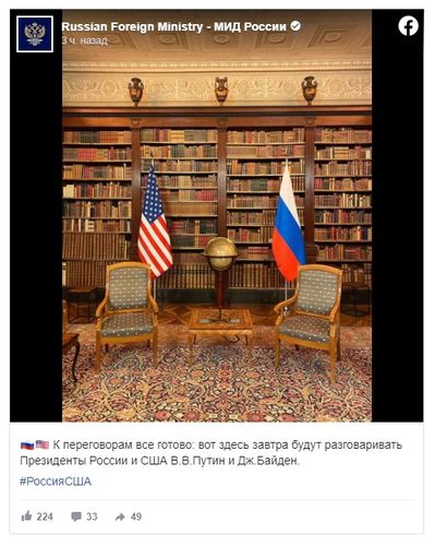 러시아 외무부가 15일(현지시간) 저녁 자체 페이스북 계정을 통해 두 정상의 회담이 진행될 스위스 제네바의 '빌라 라 그렁주' 도서관 사무실 사진을 공개했다고 러시아 관영 타스 통신이 보도했다.
