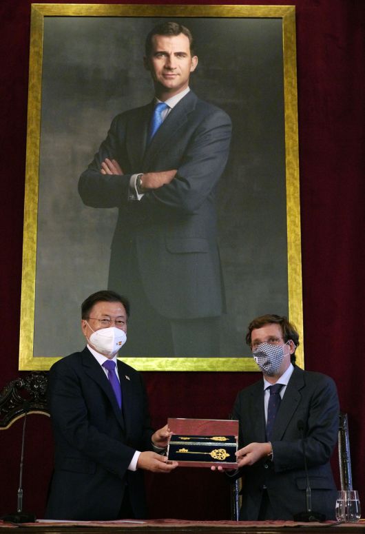 문 대통령은 또 “이 열쇠로 코로나 극복의 문을 열겠다”며 “마드리드 시민들께도 보답이 될 것. 코로나로 힘들었던 시간들을 뒤로 하고, 마드리드가 새로운 미래로 나아가길 기대한다“고 했다. 앞서 알메이다 시장은 환영사를 통해 “오늘 마드리드시는 여기 시의회 본회의장에서 국빈방문을 하신 대한민국 대통령님께 황금열쇠를 전달한다”며 “이 열쇠는 스페인의 수도, 우리 시의 문은 항상 열려 있다는 것을 상징한다”고 했다.