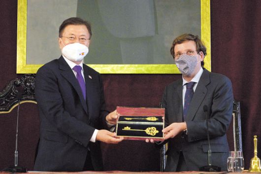 펠리페 6세 국왕은 왕실 전통에 따라 문 대통령을 맞았다. 문 대통령이 궁에 들어서자 군악대 연주와 함께 예포 21발이 발사됐다. 왕실 근위대와 기마병이 환영의 예를 갖췄다. 문 대통령은 국왕 부부에게 무궁화대훈장. 국왕은 문 대통령에 최고국민훈장, 김정숙 여사에 국민훈장 대십자장을 수여했다. 문 대통령은 이어 마드리드 시청을 찾아 호세 루이스 마르티네즈 알메이다 시장을 만났다. 알메이다 시장은 ‘황금열쇠’를 문 대통령에게 선물했다. 알메이다 시장은 “이 열쇠는 스페인의 수도, 우리 시의 문은 항상 열려 있다는 것을 상징한다”고 했다. 문 대통령은 “행운의 열쇠가 나 개인 뿐 아니라 대한민국과 한반도에 큰 행운을 가져다 줄 것으로 믿는다”며 “이 열쇠로 코로나 극복의 문을 열겠다”고 했다.