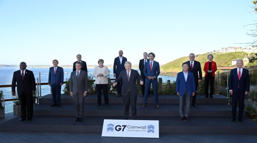 영국 콘월에서 열린 G7 정상회의에 참석한 정상들이 기념사진을 촬영하고 있다. 남성 정상들은 대부분 어두운색 양복 정장에 넥타이를 맸다. 문재인 대통령(앞줄 오른쪽 두번째)과 샤를 미셸 유럽연합(EU) 정상회의 상임의장(셋째줄 왼쪽 두번째)은 노타이 차림이다. /영국 총리실 |