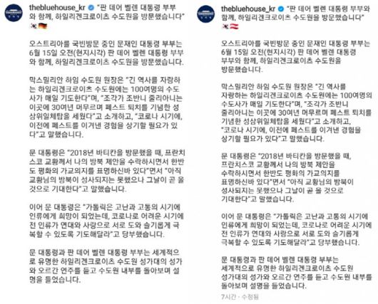 청와대가 문재인 대통령의 오스트리아 국빈 방문을 홍보하며 국기를 잘못 표기해 수정하는 해프닝이 발생했다. (사진=청와대 공식 인스타그램) |