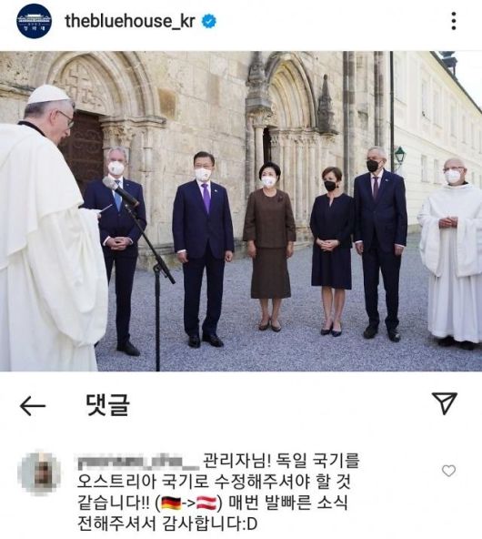 청와대 측은 해당 글이 게시된 지 6시간 만에 독일 국기를 오스트리아 국기로 바꿨다. 해당 글은 당시 야근자가 작성한 것으로 전해졌다. 오스트리아와 시차가 커 야근자가 작업했는데 글을 작성하면서 실수를 했다는 것이다.