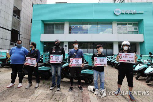 (서울=연합뉴스) 김인철 기자 = 16일 오후 서울 강남구 배민라이더스 남부센터 앞에서 라이더유니온 관계자들이 백신 휴가 보장 및 불공정한 AI 규제를 요구하며 피케팅을 하고 있다. 2021.6.16 yatoya@yna.co.kr <저작권자(c)연합뉴스. 무단전재-재배포금지.>