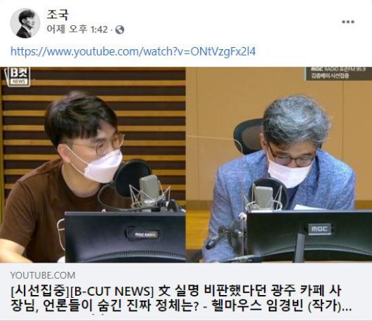 광주광역시 커피 자영업자인 배훈천씨가 '순수한 자영업자'가 맞는지 의심스럽다는 MBC 방송 내용을 지난 15일 공유한 조국 전 법무부 장관 페이스북./조 전 장관 페이스북 |