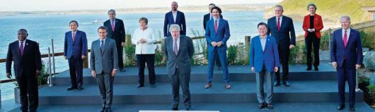 지난 12일 영국 콘월서 열린 G7 정상회의 기념 촬영 모습. 앞줄 왼쪽부터 시릴 라마포사 남아공 대통령, 에마뉘엘 마크롱 프랑스 대통령, 보리스 존슨 영국 총리, 문재인 대통령, 조 바이든 미국 대통령. 둘째 줄 왼쪽부터 스가 요시히데 일본 총리, 앙겔라 메르켈 독일 총리, 쥐스탱 트뤼도 캐나다 총리, 스콧 모리슨 호주 총리. 셋째 줄 왼쪽부터 안토니우 구테흐스 유엔 사무총장, 샤를 미셸 EU 정상회의 상임의장, 마리오 드라기 이탈리아 총리, 우르줄라 폰데어라이엔 EU 집행위원장. /영국 총리실 |