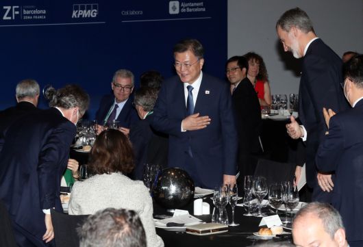 스페인을 국빈 방문 중인 문재인 대통령이 16일(현지시간) 스페인 바르셀로나에서 열린 경제인협회 연례포럼 및 개막만찬에 입장하며 펠리페 6세 국왕 등과 인사하고 있다. [연합] |