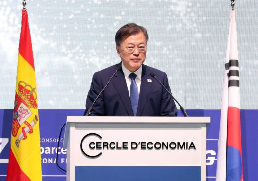 문 대통령은 이날 바르셀로나에서 열린 경제인협회 연례포럼 개막 만찬에서 “스페인은 친환경 에너지 선도국가이며 한국은 디지털 경제의 핵심인 반도체와 ICT에서 높은 기술력을 보유하고 미래차, 배터리, 수소경제 등에서 앞서있다. 경험과 노하우를 공유한다면 협력 시너지가 클 것이다. 함께 포스트코로나 시대를 선도할 것이라 확신한다”고 말했다.