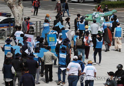 4·27 판문점 선언 3주년을 맞아 조속한 남북철도 연결을 기대하는 철도 노동자와 시민사회단체가 남북 철도가 한반도 위를 달리는 것을 형상화한 조형물과 함께 4월 27일 부산역을 출발해 임진각까지 도보 행진에 나서고 있다. [연합뉴스 자료사진] |