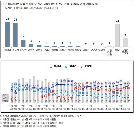 안철수 국민의당 대표와 홍준표 의원은 각각 3%, 2%의 지지율을 얻었다. 유승민 전 국민의힘 의원과 심상정 정의당 의원, 추미애 전 법무부 장관, 정세균 전 국무총리, 원희룡 제주지사는 각각 1%였다. 아울러 대통령감으로 적합한 인물이 없거나 해당 문항에 응답하지 않은 ‘태도 유보’는 32%였다.