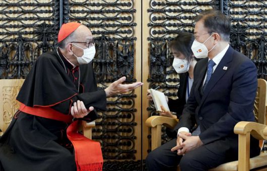 문 대통령은 “추기경님과의 만남을 통해 인종 간 화합과 평화의 연대, 그리고 코로나 팬데믹 극복을 위한 종교의 역할 등 다양한 분야에서 고견을 듣게 됐다”고 감사의 뜻을 전하며 선물을 교환했다.