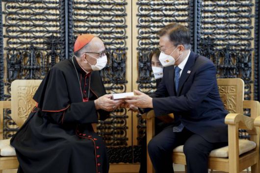 문 대통령은 "추기경님과의 만남을 통해 인종 간 화합과 평화의 연대, 그리고 코로나 팬데믹 극복을 위한 종교의 역할 등 다양한 분야에서 고견을 듣게 됐다"고 감사의 뜻을 전하며 선물을 교환했다.