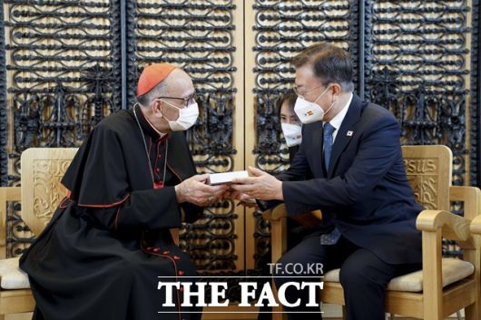 문 대통령은 "추기경님과의 만남을 통해 인종 간 화합과 평화의 연대, 그리고 코로나 팬데믹 극복을 위한 종교의 역할 등 다양한 분야에서 고견을 듣게 되었다"며고 감사의 뜻을 전하며 선물을 교환했다.