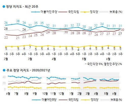 18일 한국갤럽에 따르면 지난 15~16일 이틀간 전국 만 18세 이상 1001명을 대상으로 정당 지지율을 조사한 결과, 더불어민주당은 전주와 같은 31%, 국민의힘은 3%포인트 오른 30%를 나타냈습니다.