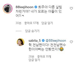 이 가운데 오나라와 전 작품 ‘99억의 여자’에서 호흡을 맞춘 배우 이지훈은 “희주야. 다른 살림 차린거야? 내가 모르는 아들이 있었어?”라고 댓글을 달며 폭풍 질투했다.