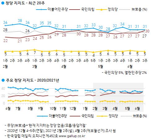 한국갤럽이 지난 15일부터 16일까지 전국 만 18세 이상 1001명을 대상으로 정당 지지도를 조사한 결과 더불어민주당은 31%로 지난주 조사 결과와 같았다. 국민의힘은 30%로 지난주 조사보다 3%포인트 상승했다. 국민의당과 정의당 지지도는 각각 5%, 열린민주당 지지도는 2%였다. 무당층은 27%로 나타났다.