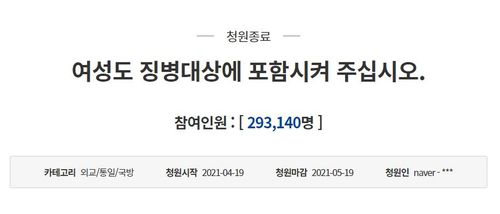 앞서 한 청원인은 출산율 감소로 군 병력 보충에 큰 차질을 빚고 있고 남성 징집률이 90%에 육박한다며 여성에 대한 징집제 도입을 검토할 것을 요구했고, 이에 29만명 이상이 동의했다.