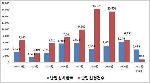 올해 1∼4월 난민 심사 건수는 3천879건으로, 넉 달 만에 역대 최대치였던 지난해(6천254건)의 절반을 넘어섰다. 매달 약 1천 건씩 난민 심사를 마친 셈이다.