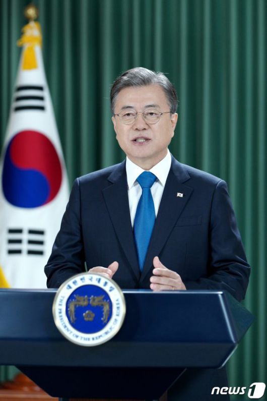 (서울=뉴스1) = 문재인 대통령이 제75차 유엔 총회 기조연설을 영상으로 전하고 있다. (청와대 제공) 2020.9.22/뉴스1 /사진=뉴스1화상 |