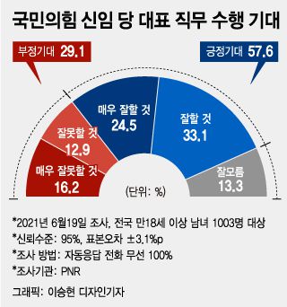 연령별로는 20대 55%, 30대 51.7%, 40대 51.7%, 50대 59.7%, 60대 이상 65%로 모든 세대에서 50%를 넘었다. 국민의힘 지지층의 긍정기대는 78.5%에 달했다. 민주당 지지층에선 긍정기대 37.2%, 부정기대 45.9%로 나타났다.