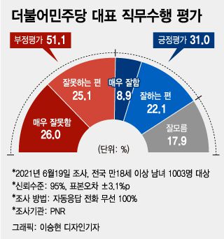 여야 당대표에 대한 여론의 반응이 엇갈렸다. 송영길 더불어민주당 대표의 직무수행을 부정적으로 평가한 비중이 50%를 넘은 데 반해 이준석 국민의힘 대표에 대한 긍정기대는 58%에 육박했다.