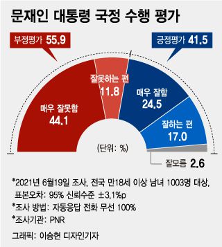 이번 조사는 전국 만 18세 이상 남녀 1003명을 대상으로 자동응답 전화조사 무선 100% 방식으로 진행됐다. 응답율은 2.8%로 표본오차는 95% 신뢰수준에서 ±3.1%포인트다. 2021년 3월 행정안전부 주민등록인구를 기준으로 지역별, 성별, 연령별 가중값을 부여(림 가중)했다. 자세한 조사 개요와 결과는 중앙선거여론조사심의위원회 홈페이지를 참고하면 된다.