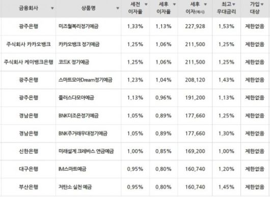 20일 금융감독원 금융상품 통합비교공시에 따르면 은행 정기예금 가운데 24개월 기준 금리가 가장 높은 상품은 광주은행 ‘미즈월복리정기예금’으로, 연 1.33%(세전) 금리를 제공했다. 지난주보다 1.10%포인트 오른 수준이다.