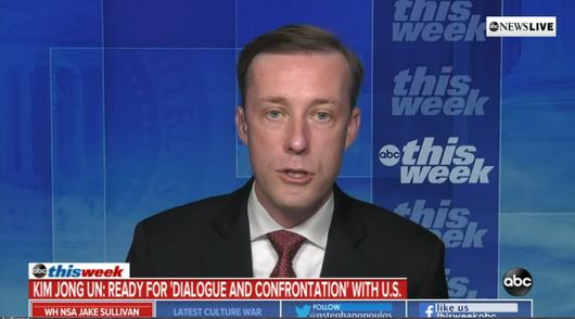 제이크 설리번 백악관 국가안보보좌관은 20일(현지시간) ABC방송의 ‘디스위크’ 인터뷰에서 김정은 북한 노동당 총비서 겸 국무위원장이 당 전원회의에서 ‘대화와 대결’을 말한 데 대해 “흥미로운 신호”라며 북·미 비핵화 협상에 대한 북한의 분명한 신호를 기다리고 있다고 말했다./사진=ABC방송 캡처 |