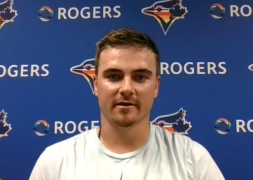 인터뷰하는 토론토 백업 포수 리즈 맥과이어 |