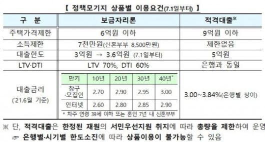 보금자리론 대출 한도도 세대당 3억원에서 3억6000만원(최대 주택담보대출비율(LTV) 70%)으로 확대된다.