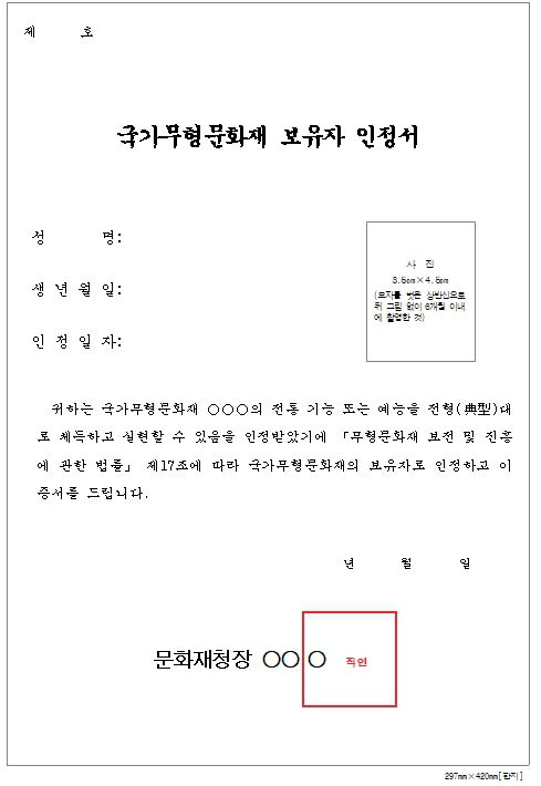 국가무형문화재 보유자·보유단체 인정서에서 지정번호가 사라진다. 문화재청은 이 같은 내용의 '무형문화재 보전 및 진흥에 관한 법률 시행규칙'을 23일부터 시행한다고 21일 전했다.