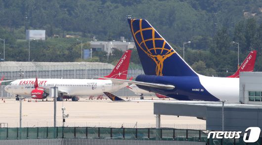 (인천공항=뉴스1) 임세영 기자 = 성정의 이스타항공 인수가 사실상 확정된 가운데 21일 법원이 최종 우선협상대상자를 발표한다. 앞서 성정은 지난 17일 이스타항공 매각주관사인 딜로이트안진에 우선매수권을 행사하겠다는 공문을 보냈다. 21일 인천국제공항 제1여객터미널 계류장에 이스타항공 여객기가 대기하고 있다. 2021.6.21/뉴스1