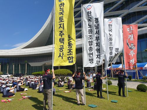 (진주=연합뉴스) 지성호 기자 = 한국토지주택공사(LH) 노조가 21일 경남 진주 본사에서 투쟁 궐기대회를 열고 "지난 7일 발표한 정부의 졸속이고 일방적인 LH 혁신안을 반대한다"고 밝혔다.