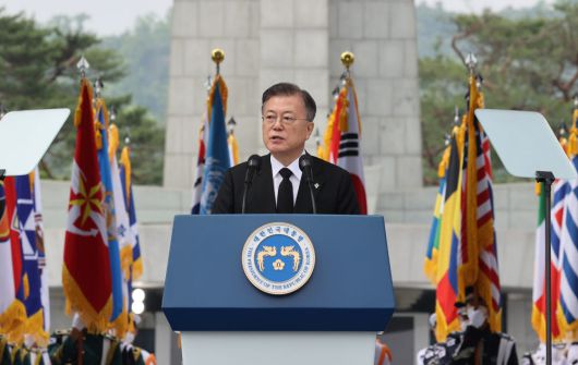 문재인 대통령이 6일 서울시 동작구 국립서울현충원에서 열린 제66회 현충일 추념식에 참석, 추념사를 하고 있다. |