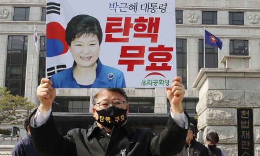 조원진 우리공화당 대표가 지난 3월 10일 오후 서울 종로구 헌법재판소 앞에서 열린 박근혜 전 대통령 탄핵 무효 기자회견에 앞서 피켓 시위를 하고 있다. 뉴스1 |