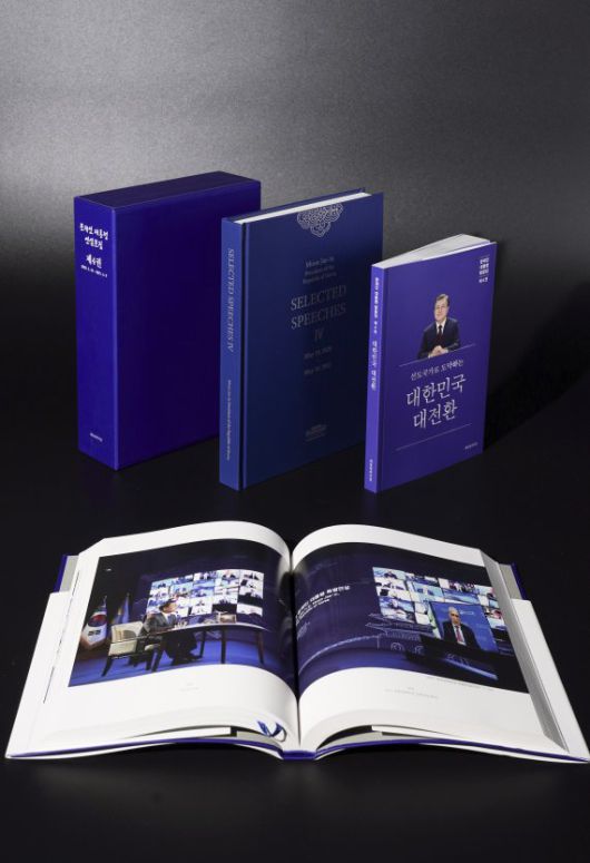 21일 청와대에 따르면 문 대통령의 네 번째 연설문집과 말글집 '선도국가로 도약하는 대한민국 대전환'이 출간됐다. 2020년 5월 10일부터 2021년 5월 9일까지 문 대통령의 주요 메시지와 사진을 담은 4년차 1년간의 기록이다.