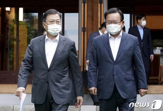 문재인 대통령이 지난 5월 17일 청와대 상춘재에서 김부겸 국무총리와 첫 주례회동을 마친 후 대화하고 있는 모습./사진=뉴스1 |
