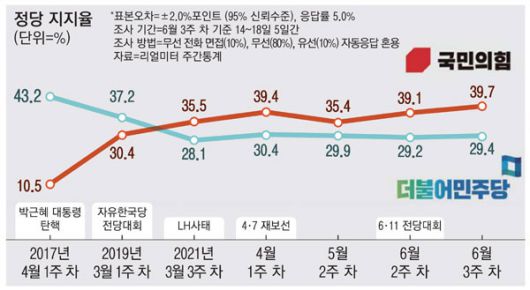 21일 리얼미터가 YTN 의뢰로 지난 14~18일 전국 만 18세 이상 2514명에게 정당 지지도를 조사한 결과, 국민의힘 지지도는 지난주보다 0.6%포인트 상승한 39.7%로 나타났다. 지난 4월 1주차 조사에서 39.4%를 기록한 이후 가장 높은 수치다. 반면 더불어민주당의 3주차 지지도는 전주보다 0.2%포인트 오른 29.4%에 머물렀다.