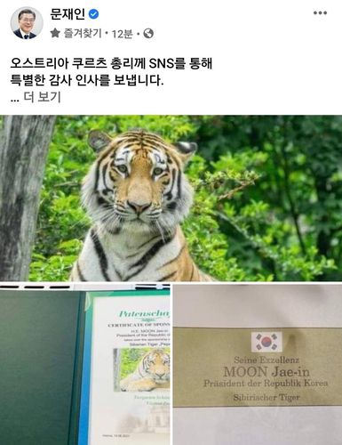 문 대통령은 이날 SNS에 올린 글에서 "오스트리아 쇤브룬궁에는 세계에서 가장 오래된 동물원이 있다"며 "제가 방문하기 직전에 어린 시베리아 호랑이가 이 동물원에 입주했는데, 제바스티안 쿠르츠 총리가 그 호랑이의 후원자로 저를 지정해줬다"고 소개했다.