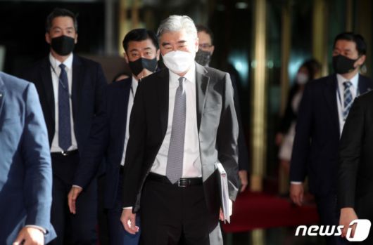 (서울=뉴스1) ,송원영 기자 = 성 김 미국 국무부 대북특별대표가 22일 오전 서울 종로구 정부서울청사에 들어서고 있다. 이날 성 김 대표는 이인영 통일부 장관을 예방하고 최영준 통일부 차관과 대북정책 고위급 양자협의를 진행한다. 2021.6.22/뉴스1 |