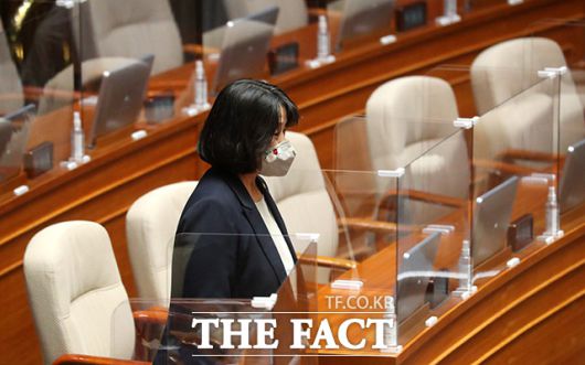 [더팩트ㅣ국회=이선화 기자] '불법 부동산 투기 의혹'으로 더불어민주당에서 제명된 윤미향 의원이 22일 오후 서울 여의도 본회의장에서 열린 정치·외교·통일·안보 분야 대정부질문에 참석하고 있다.