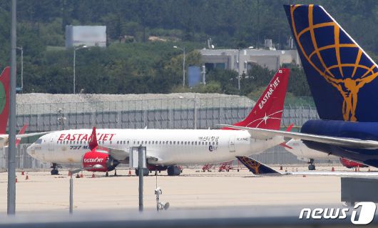 21일 인천국제공항 제1여객터미널 계류장에 이스타항공 여객기가 대기하고 있다. 2021.6.21/뉴스1 © News1 임세영 기자 |