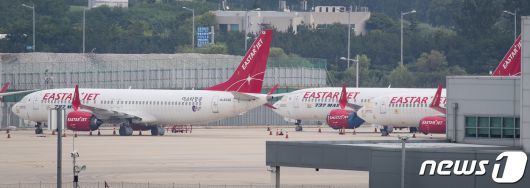 (인천공항=뉴스1) 유승관 기자 = 성정의 이스타항공 인수 본계약 체결을 하루 앞둔 23일 인천국제공항 제1여객터미널 계류장에 이스타항공 여객기가 멈춰 서 있다.