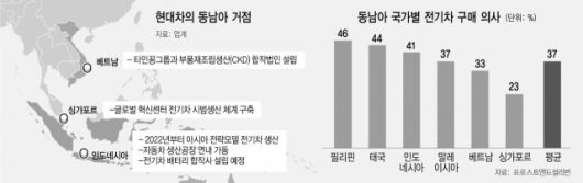 그러나 전기차 시대에는 아직 뚜렷한 강자가 없다. 반전을 노릴 틈이 있는 것이다. 완성차 업계의 한 관계자는 “전기차의 신흥 허브가 될 것으로 예상되는 동남아에서 소비자들에게 현대차·기아의 전기차 이용 경험을 넓혀 시장을 선점하려는 계획으로 풀이된다”고 말했다.