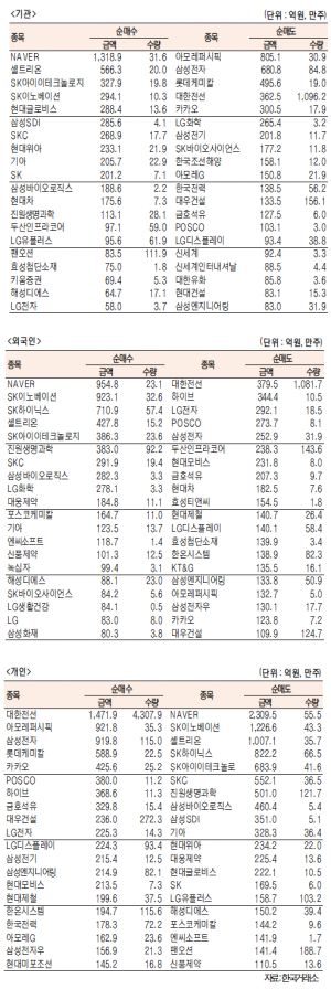 [표]유가증권 기관·외국인·개인 순매수·도 상위종목(6월 23일-최종치)
