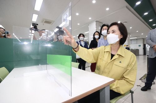 유은혜 사회부총리 겸 교육부 장관이 지난 17일 오후 2학기 대면 수업을 앞둔 서울대학교 내 학생식당에서 다중이용시설 방역 현황을 점검하고 있는 모습. [사진 = 연합뉴스] |