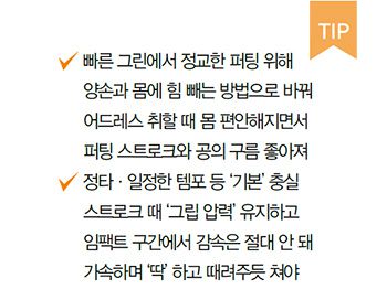 정리해볼게요. 자세보다는 편안하게 어드레스를 서고 스트로크를 할 때에는 그립을 잡은 손의 압력이 변하지 않도록 하세요. 또 정타는 기본. 임팩트 구간에서 공을 때리는 것이 아니라 헤드가 가속이 되면서 지나가야 합니다. 이렇게 하면 ‘딱’ 하는 기분 좋은 타구감을 느낄 수 있을 겁니다.