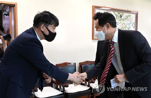 송재혁 예산결산특별위원회 위원장과 악수하는 오세훈 서울시장 |