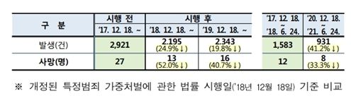 서울경찰청에 따르면 음주운전 처벌이 강화된 2018년 12월 18일 이후 1년 동안 서울의 음주운전 교통사고는 2,195건 발생했고, 이로 인해 13명이 숨졌습니다. 처벌 강화 전 1년 동안 사고 2,921건, 사망자 27명이 발생한 데 비해 각각 24.9%, 52.0% 감소한 수치입니다. 처벌 강화 2년 차인 2019년 12월 18일 이후부터 1년 동안은 사고 2,343건, 사망자 16명이 발생했습니다.