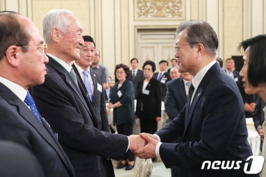 문재인 대통령이 4일 청와대 영빈관에서 열린 국가유공자 및 보훈가족 초청 오찬에서 박희모 6.25 참전유공자회장과 인사하고 있다. (청와대 제공) 2019.6.4/뉴스1 |